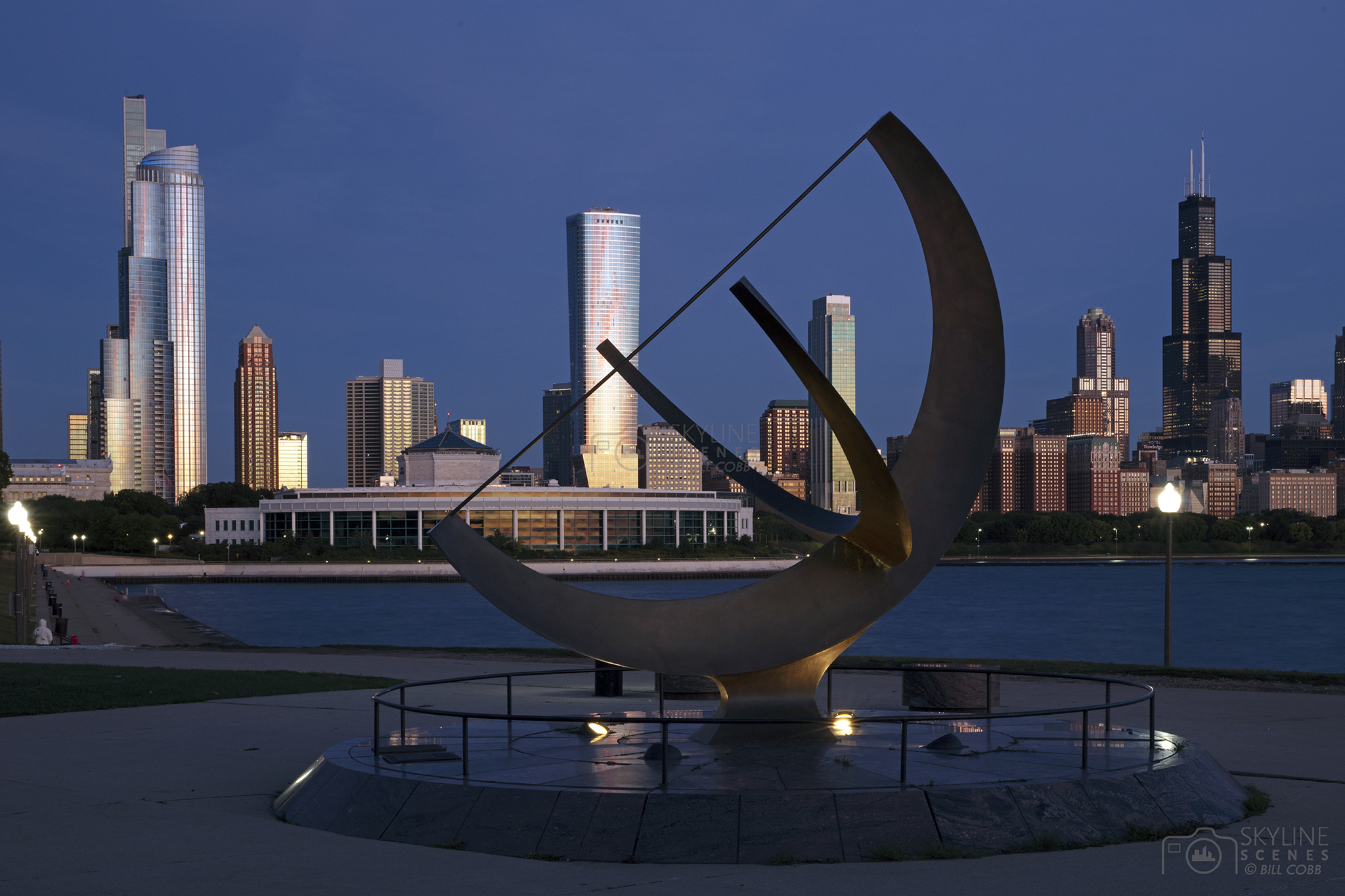 Man Enters the Cosmos bronze sculpture near the Adler Planetarium in with the Chicago skyline at sunrise